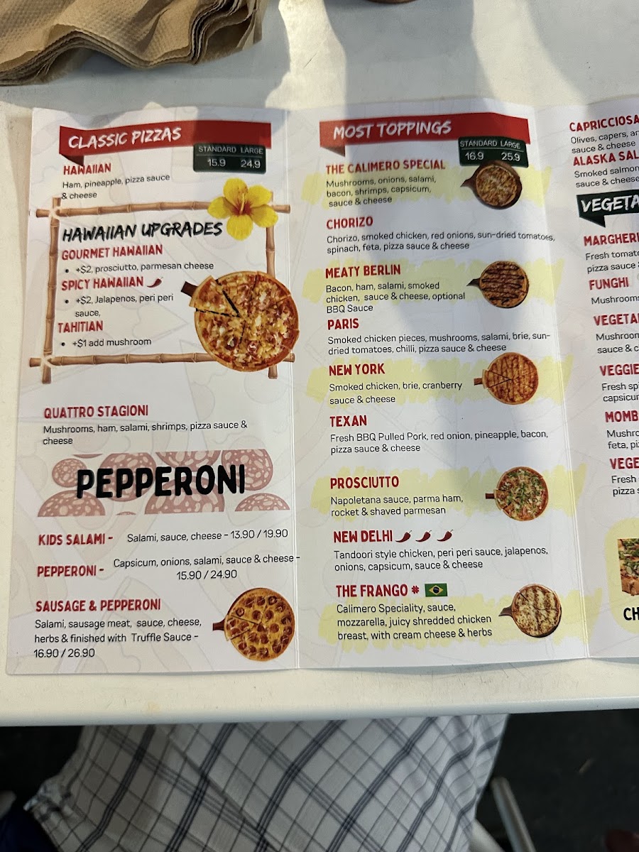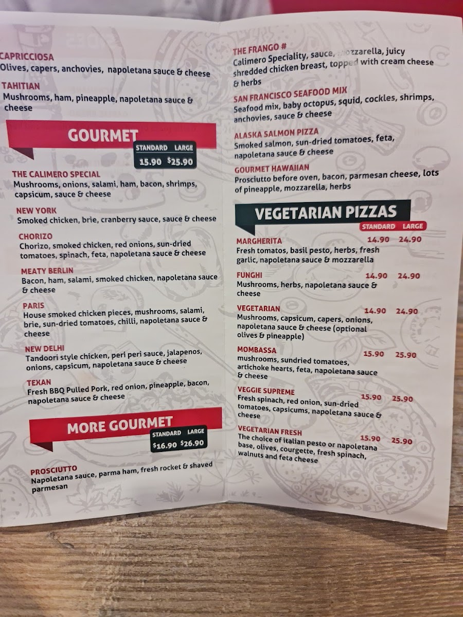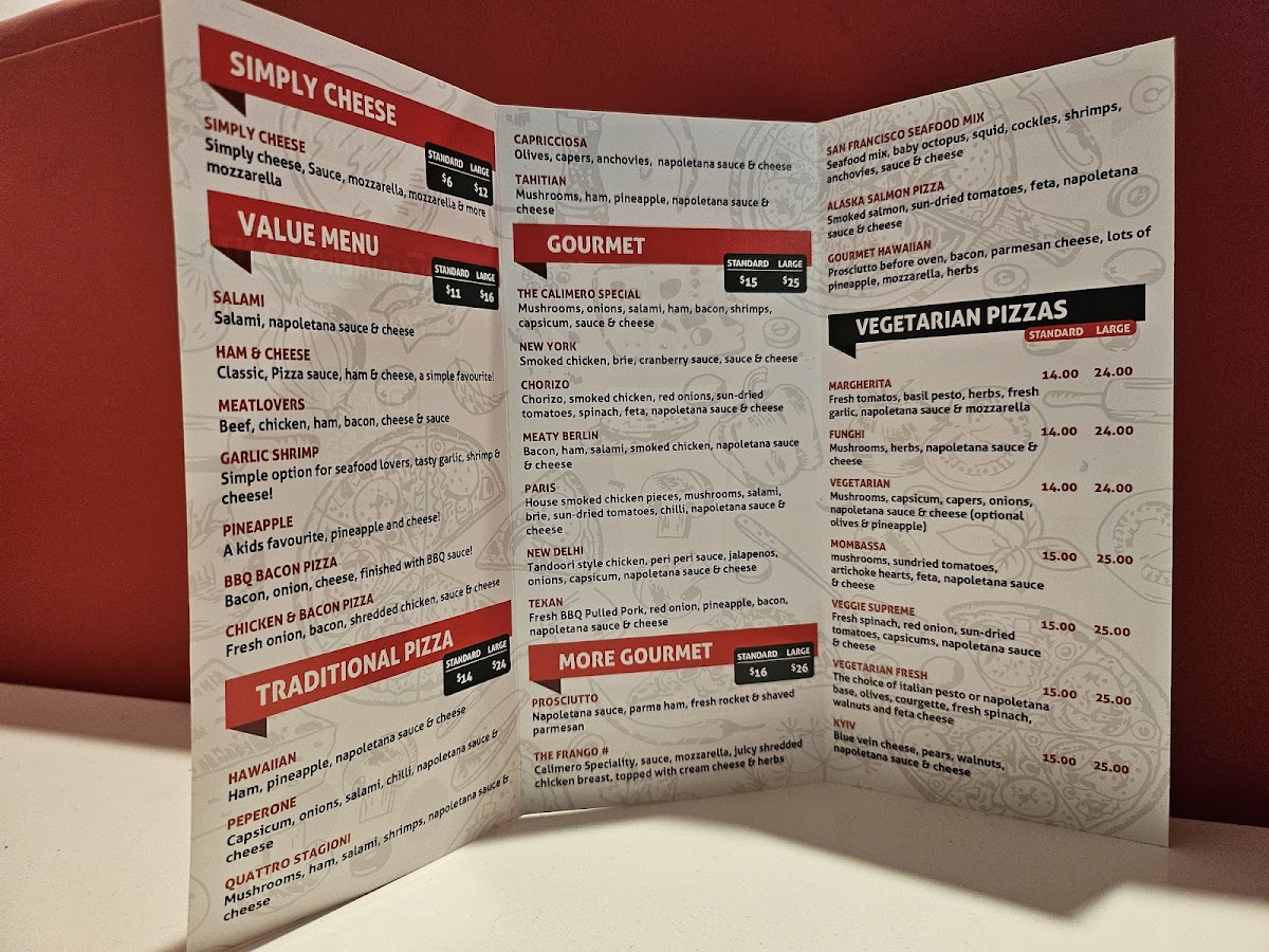 The menu at Calimero Pizza in Devonport offers a diverse and flavorful selection that caters to all tastes, from traditional favorites to inventive gourmet options. Their Traditional Pizzas include classics like Hawaiian Pizza and Peperone Pizza, with rich toppings at reasonable prices. The Gourmet Pizzas shine with choices like Calimero Pizza and New York Pizza, each brimming with unique ingredients and bold flavors. For a more refined experience, their More Gourmet section features Prosciutto Pizza, San Francisco Seafood Pizza, and the luxurious Alaska Salmon Pizza. For vegetarians, there’s a delightful array of pizzas like Margherita Pizza, Funghi Pizza, and Veggie Supreme Pizza. The Brazilian Specials are a highlight, offering a taste of South America with options such as Frango Catupiry and the tangy Calabresa Acebolada. With such a wide range of pizza styles, Calimero Pizza ensures there's something for everyone to enjoy, whether you prefer a simple classic or a gourmet creation.